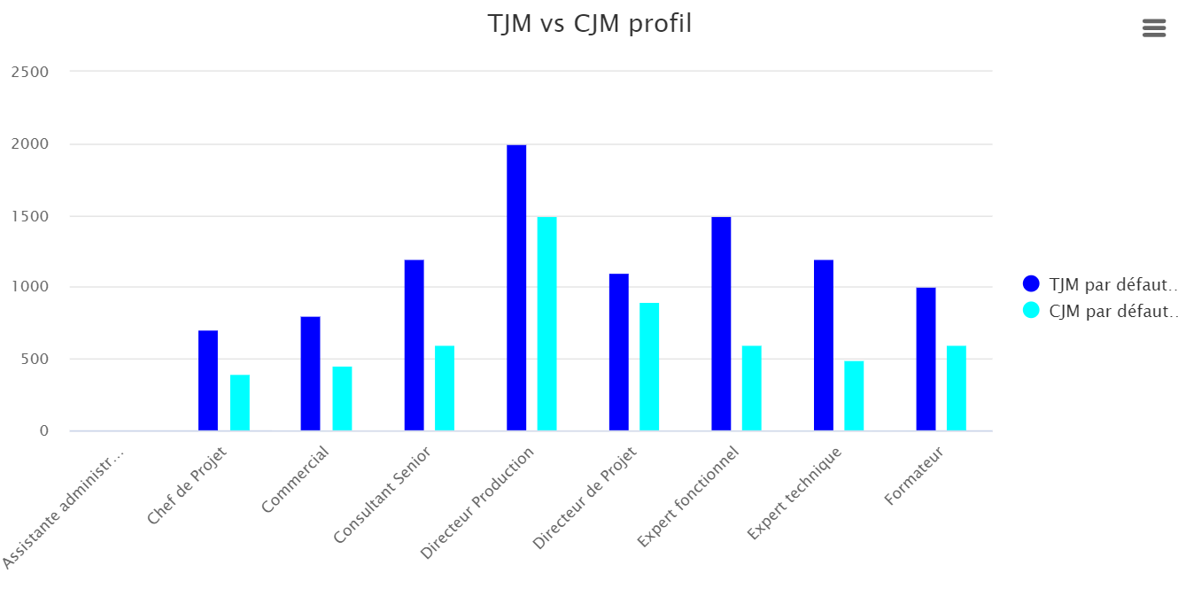Ce graphique permet de visualiser la répartition du TJM et CJM moyen, en € pour chaque BU. L'objectif est d'analyser la répartition des coûts et ventes par profil collaborateur. La comparaison des deux données permet d'analyser la marge effectuée. La répartition, en €, du TJM/CJM peut être visualisée selon une période donnée, configurable dans les filtres.