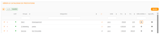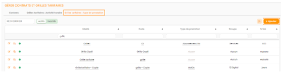 Retrouver le type de prestation dans le catalogue de prestation et ajouter sa grille tarifaire en cliquant sur le bouton + à la fin de la ligne.