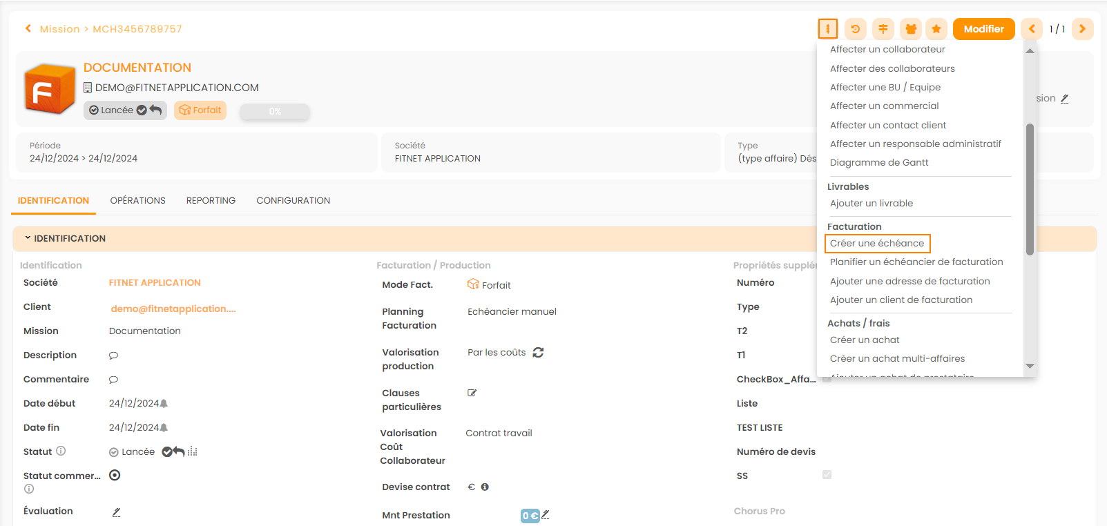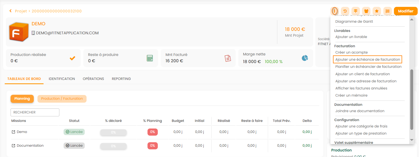 Pour créer un acompte qui porte sur l’ensemble du projet, tout en conservant la facturation spécifique architecte, il faut créer une échéance sur le projet depuis le bouton “Actions”.