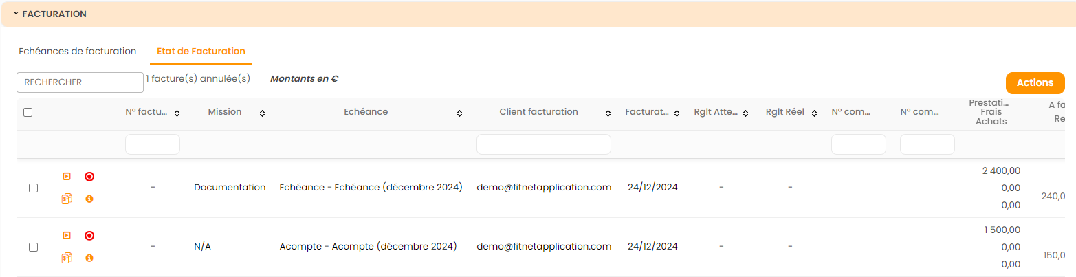 Le volet facturation du projet liste à la fois les échéances du projet et celles des affaires.