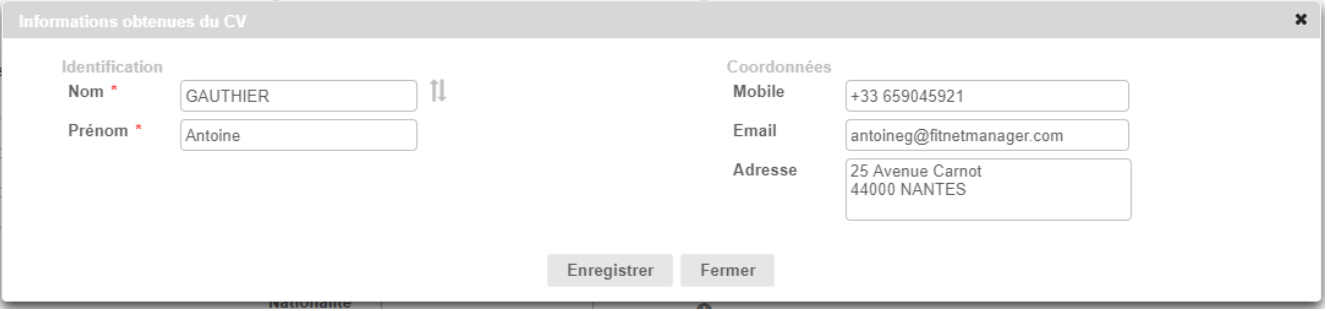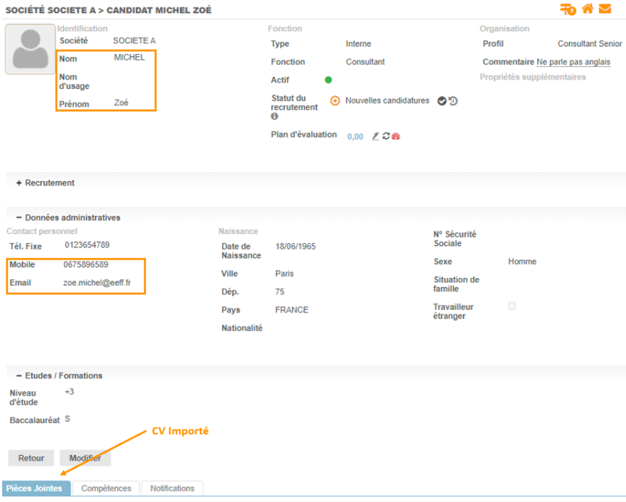 Une fois la fiche enregistrée, vous retrouverez les données issues de l'analyse du CV répertoriées dans la fiche du candidat.