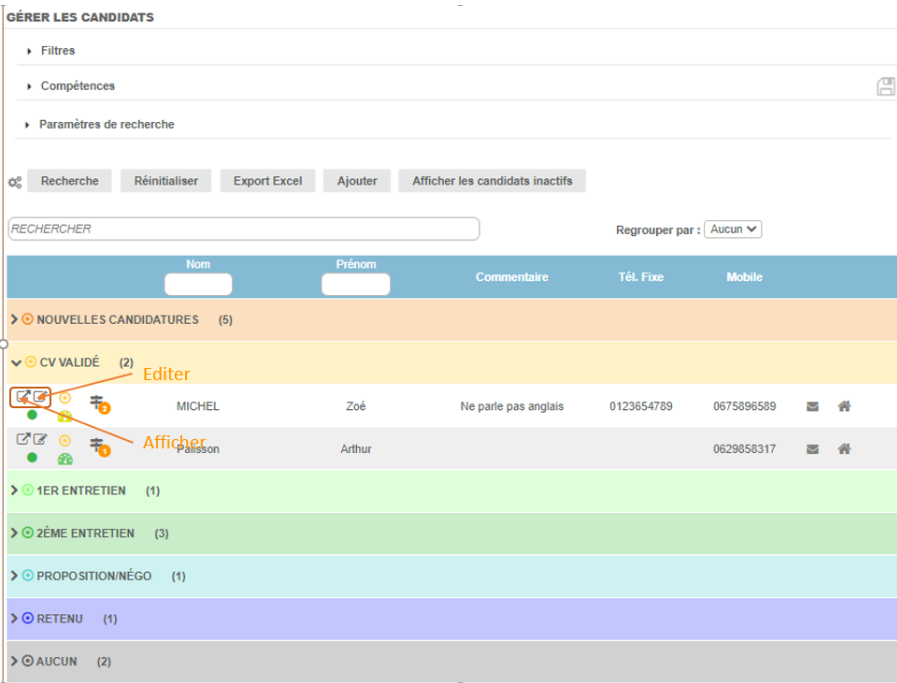 Les candidats créés s’affichent dans l’onglet “gérer les candidats” et peuvent être modifiés ou affichés en cliquant sur les icônes correspondant à gauche du tableau.