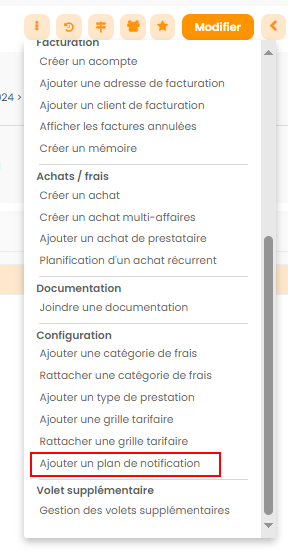 --> Spécifique: Le plan de notifications est à ajouter manuellement sur l'objet du module via le bouton Action > Ajouter un plan de notifications.