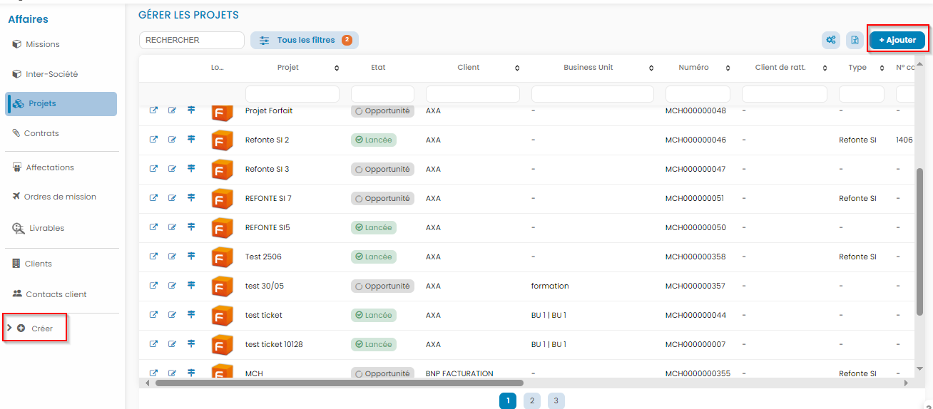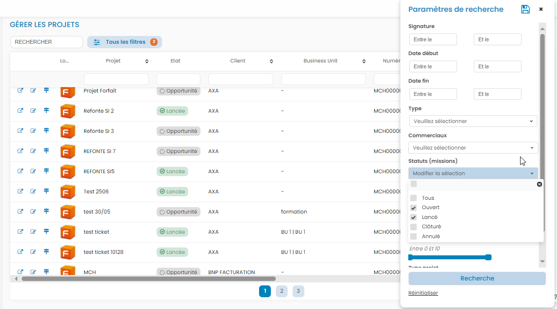 Dans Affaires>Projets, nous avons désormais des filtres de recherche qui nous permettent d'affiner l'affichage.