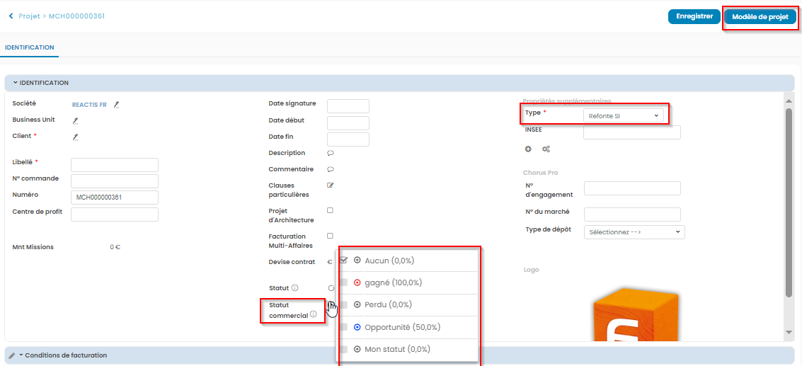 Dans l'outil de création, je peux donc choisir un type de projet, dans la colonne de droite, puis choisir mon statut commercial, avant d'appuyer sur enregistrer. Je peux également, éventuellement, m'appuyer sur le modèle de projet.