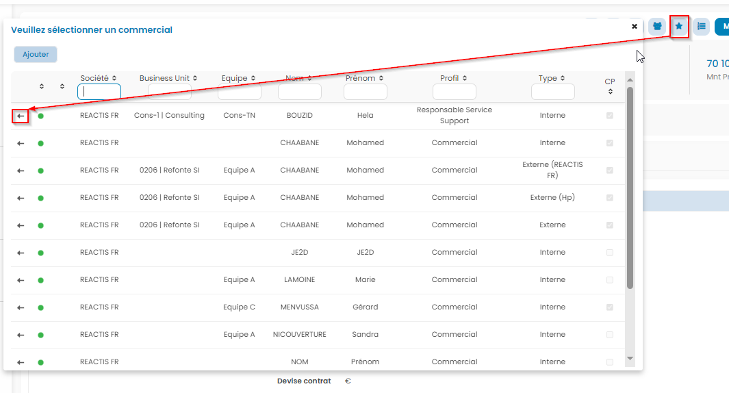 - Affecter un commercial: de manière similaire à une affaire, je peux affecter mon commercial avec Actions>Affecter un commercial, ce qui lui donnera des accès particuliers à ce projet
