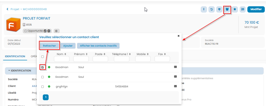 - Affecter un contact client: je peux identifier, pour faciliter mes échanges, la personne qui est responsable de l'opportunité chez mon client.