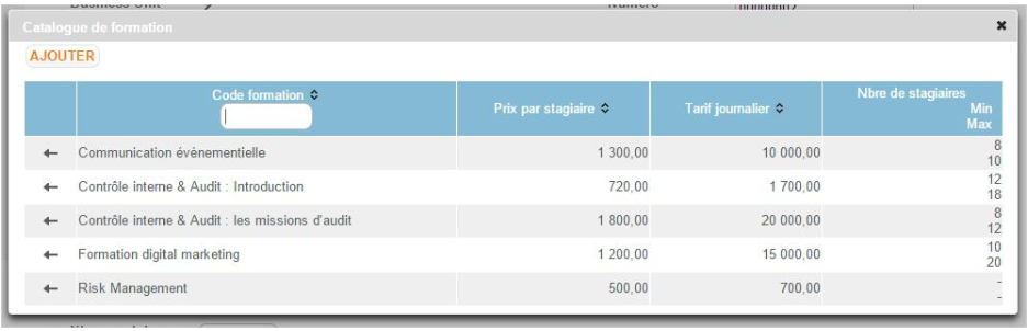 Le catalogue de Formations permet de pré-renseigner automatiquement les propriétés de la Formation au formulaire de saisie : le code Formations, le nom de la Formation, le libellé, les objectifs, le contenu, le nombre minimum et maximum de stagiaires et le prix/tarif par participants.