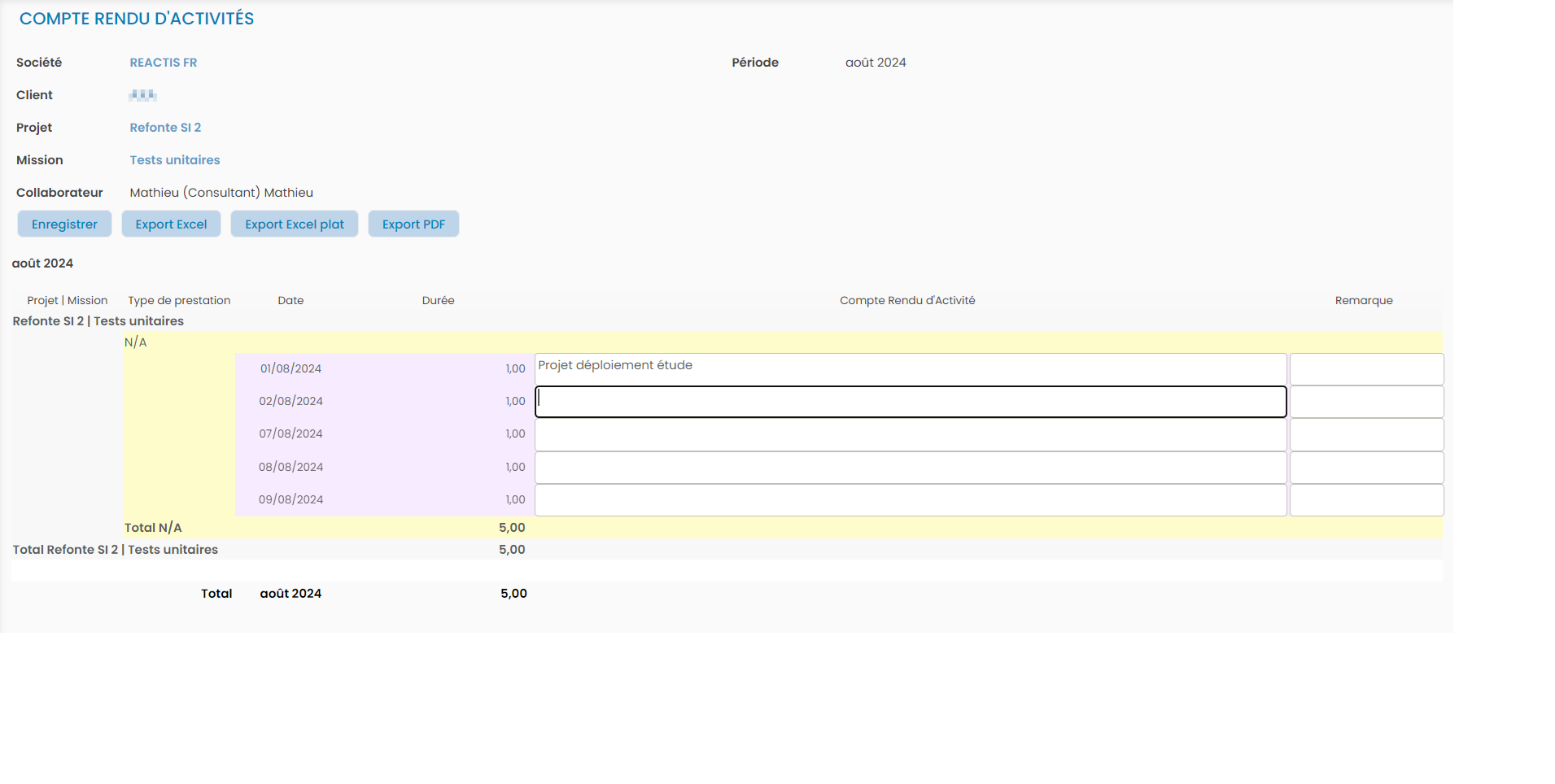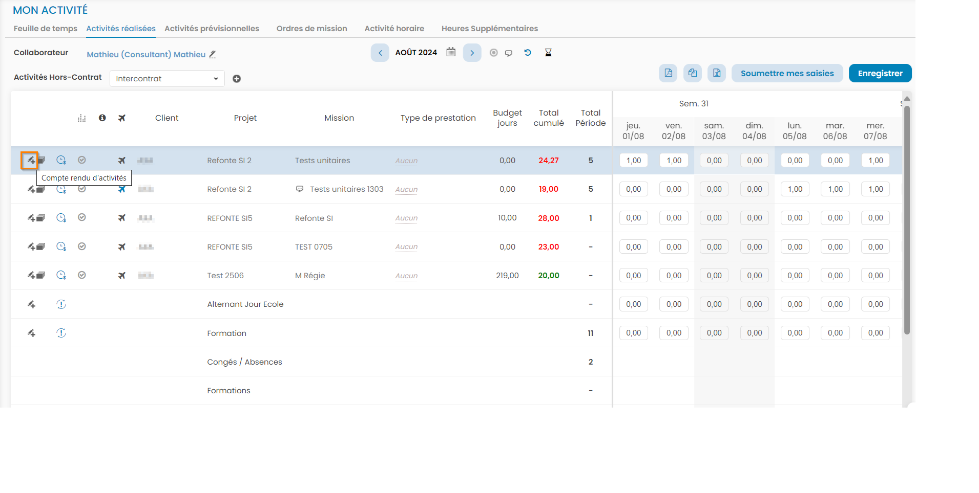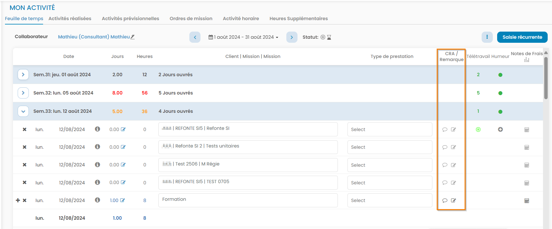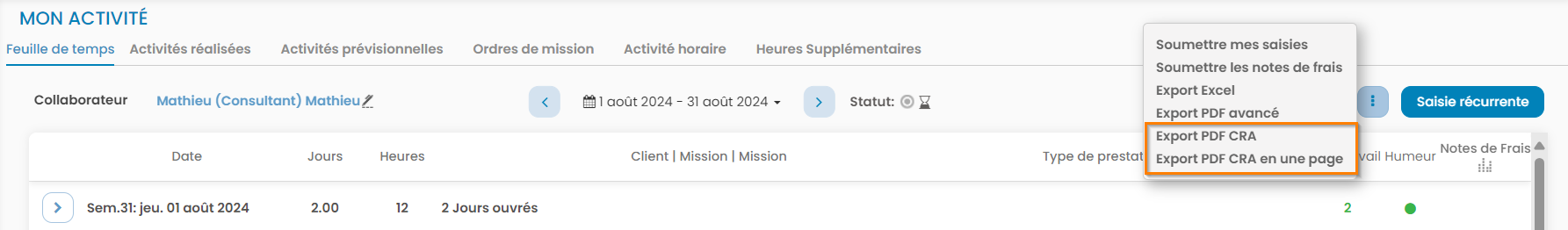 CRA depuis l'onglet "Activité réalisée"