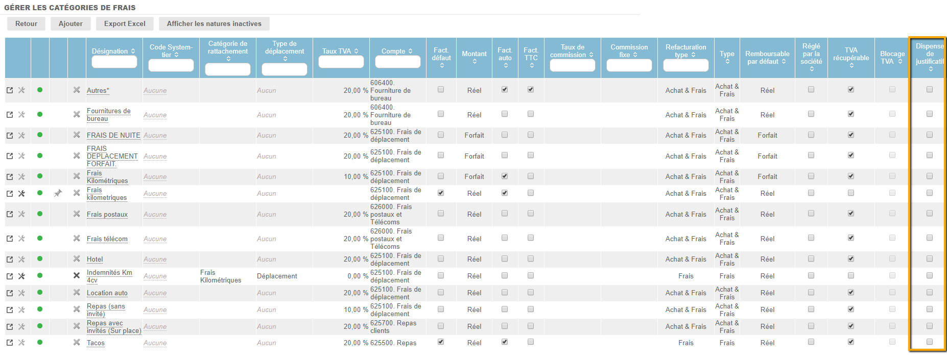 Cependant, il peut arriver que vous ayez des catégories sans justificatifs, comme pour les frais kilométriques. Dans ce cas, l'activation du second paramètre (Paramétrage>Activités>Frais>Bloquer la soumission de NDF à validation si pas de justificatif rattaché) ajoute une colonne Dispense de justificatif dans les catégories de notes de frais. Celle-ci vous permet d'enlever le côté obligatoire pour chacun des frais de cette catégorie.