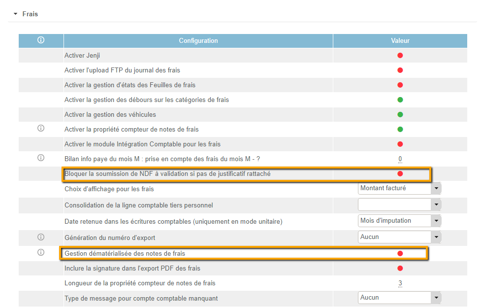 Deux paramètres complémentaires sont liés à la gestion dématérialisée des notes de frais, dans Paramétrage>Activités>Frais.
