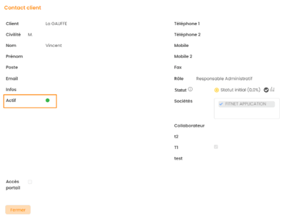 Vous pouvez  désactiver un contact prospect en cliquant sur la pastille - disponible sur la fiche du contact prospect (vert : actif, rouge : inactif) :