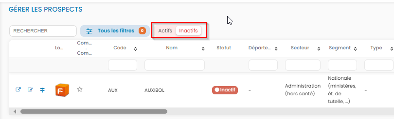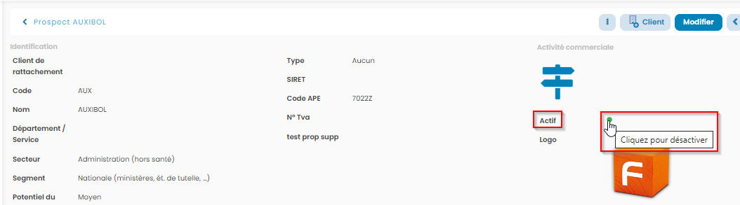 Note : si vous souhaitez désactiver un prospect qui n'a jamais été utilisé dans la base, vous pouvez modifier les données créées pour créer un nouveau client (modification du code, nom, secteur etc...).