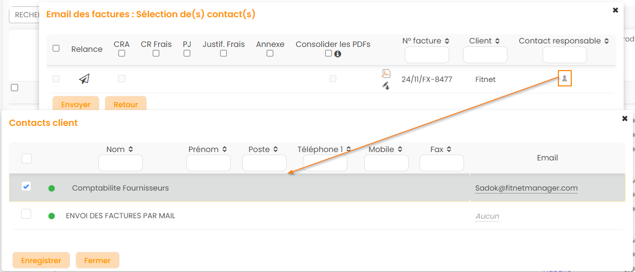 Cela permet de modifier le contact responsable sélectionné à l'enregistrement de la facture, ainsi que de sélectionner plusieurs contacts à qui l'envoyer