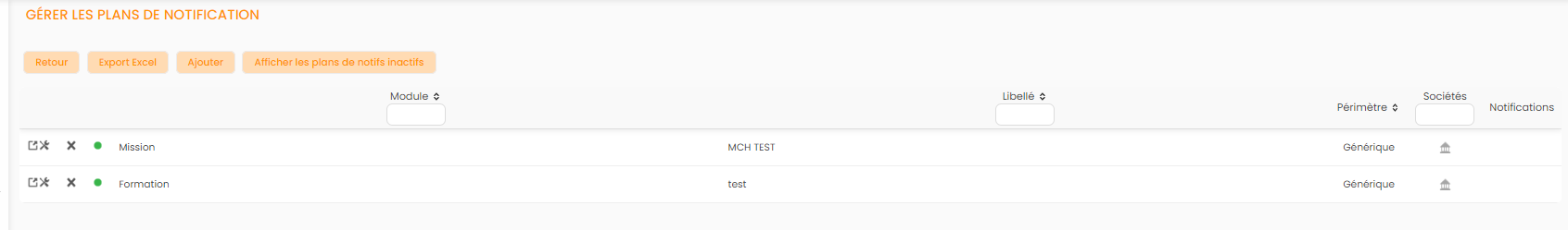 Le tableau de gestion des plans de notifications