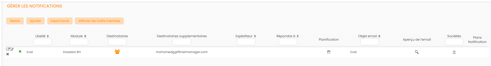 Les actions de modification, de désactivation et de suppression d'un plan de notification générique se font depuis la Configuration > E-mail > Plans de notifications