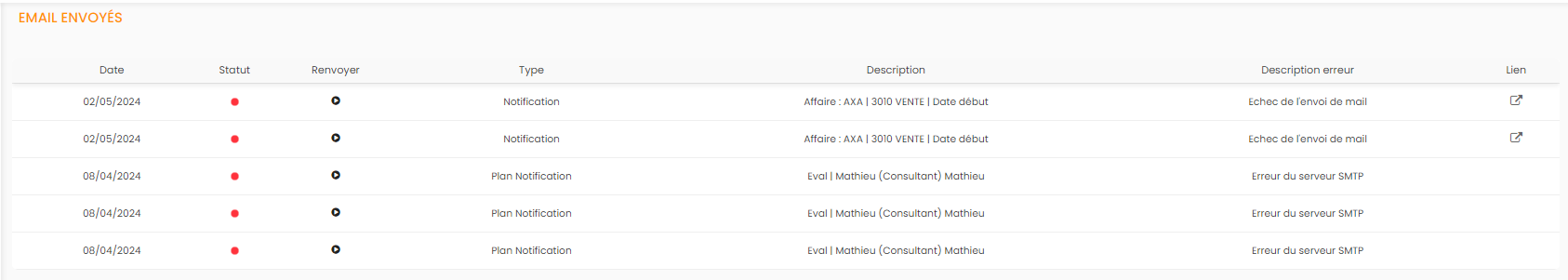 Cet historique regroupe l'ensemble des emails envoyés depuis la solution. Les colonnes "statut" et "description erreur" vous permettront de comprendre pourquoi l'email n'a pas été envoyé s'il y a eu échec d'envoi.