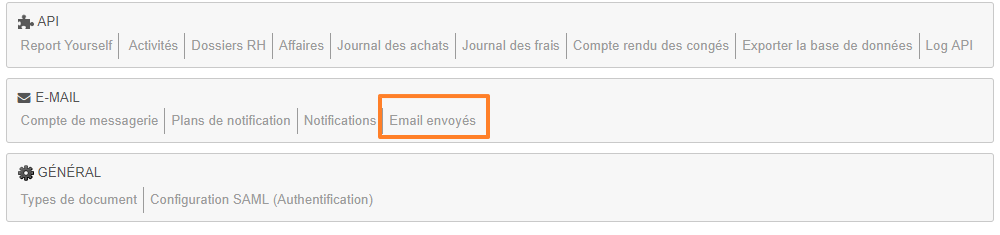 Si la notification n'a pas été envoyée, un historique des envois est disponible dans la Configuration > Emails envoyés: