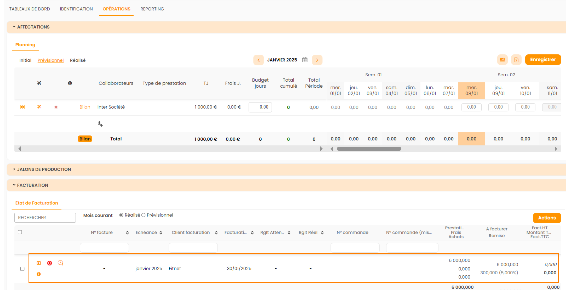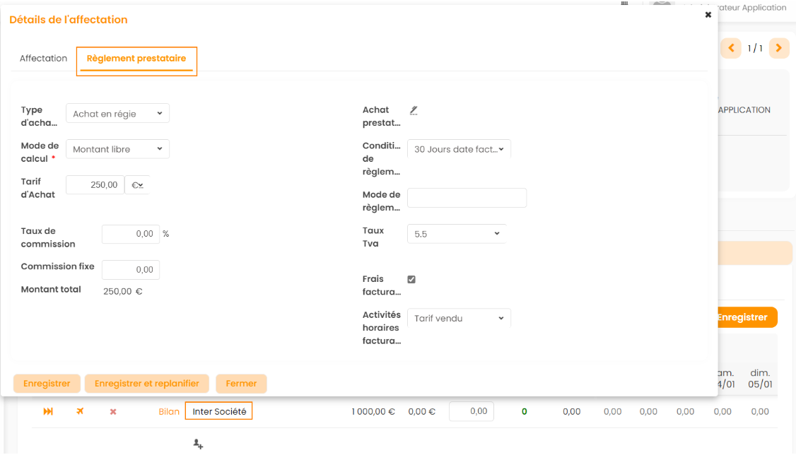 Comme pour la saisie d'un collaborateur externe, une section "Réglement prestataire" permet de renseigner le tarif d'achat qui sera utilisé pour créer la facture entre SA et SB, et ce directement depuis le détail de l'affectation.