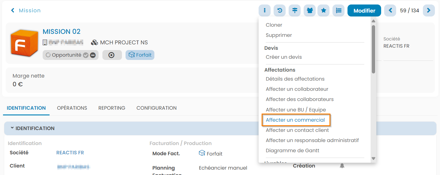 Pour affecter un commercial sur les affaires, il suffit d'aller sur la fiche de l'affaire et cliquer sur le bouton Actions > Affecter un commercial