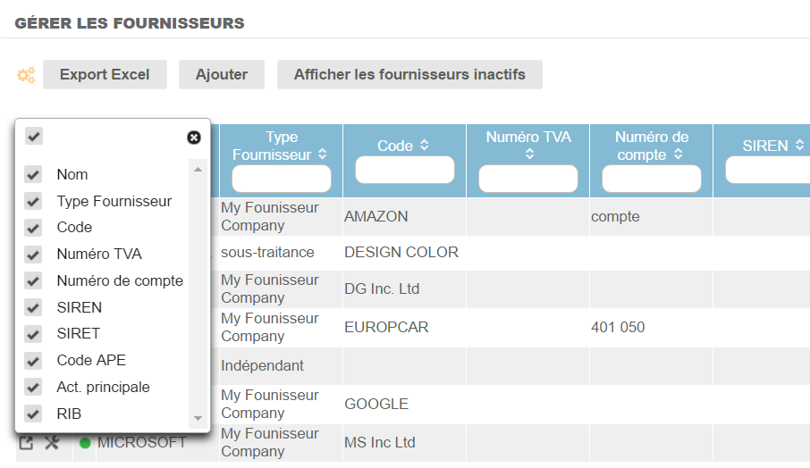 Le tableau de gestion permet de rechercher rapidement un fournisseur via les entêtes de colonnes. Il est également personnalisable en terme de choix de colonne.