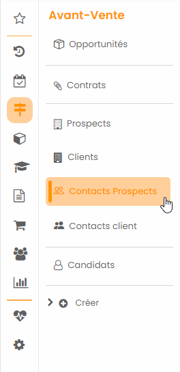 Si le paramètre "Avant-vente" est activé, le chemin des prospects suit le processus suivant : Avant-vente → Contacts Prospects.