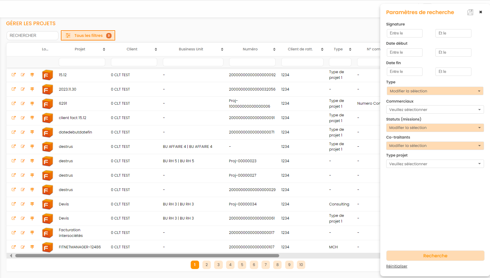 Les paramètres de recherche permettent de retrouver un projet en fonction de :