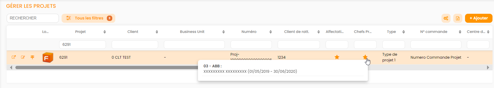 En particulier dans le tableau Gérer Les Projets il est possible d'avoir un rapide aperçu du chef de projet et des affectations en se positionnant sur l'étoile