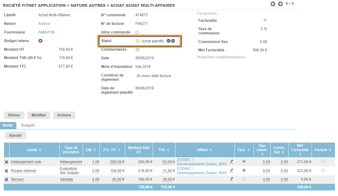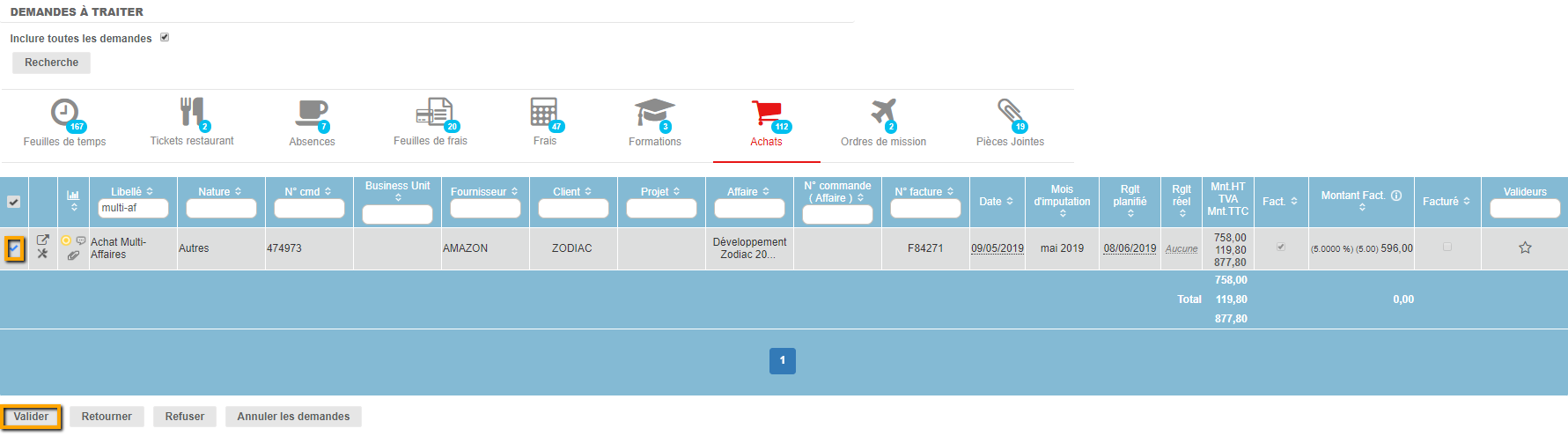 Dans les demandes à traiter, l'achat multi-affaires se comporte comme un achat unique. On peut donc le valider pour le faire passer au statut suivant :