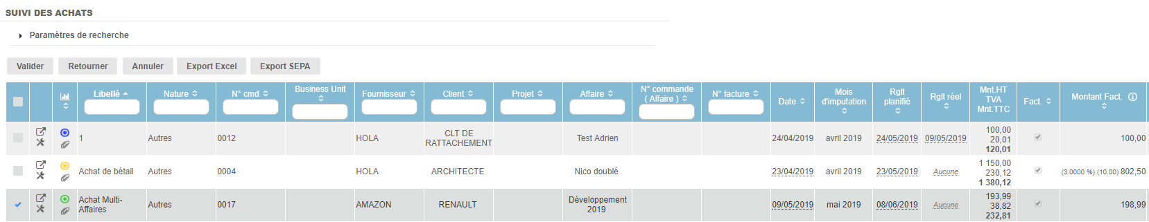 Si le workflow est désactivé, il est possible de faire avancer le statut, pour tous les types d'achat, en cliquant la coche et en appuyant sur Actions>Valider. Ce n'est pas le cas pour l'achat multi-affaires. Il faut rentrer dans l'achat global pour pouvoir le faire avancer.