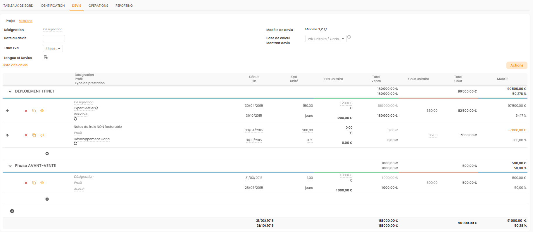 Le détail du devis de chaque affaire remonte au niveau du projet, il est également possible de chiffrer le projet avec un autre devis voir "Le chiffrage du projet ".