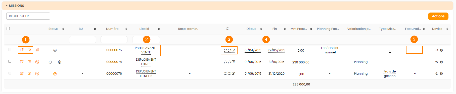 Toutes les information des affaires liées à un projet remontent dans le projet : Les devis, les missions, les affectations, la facturation, le tableau de bord.