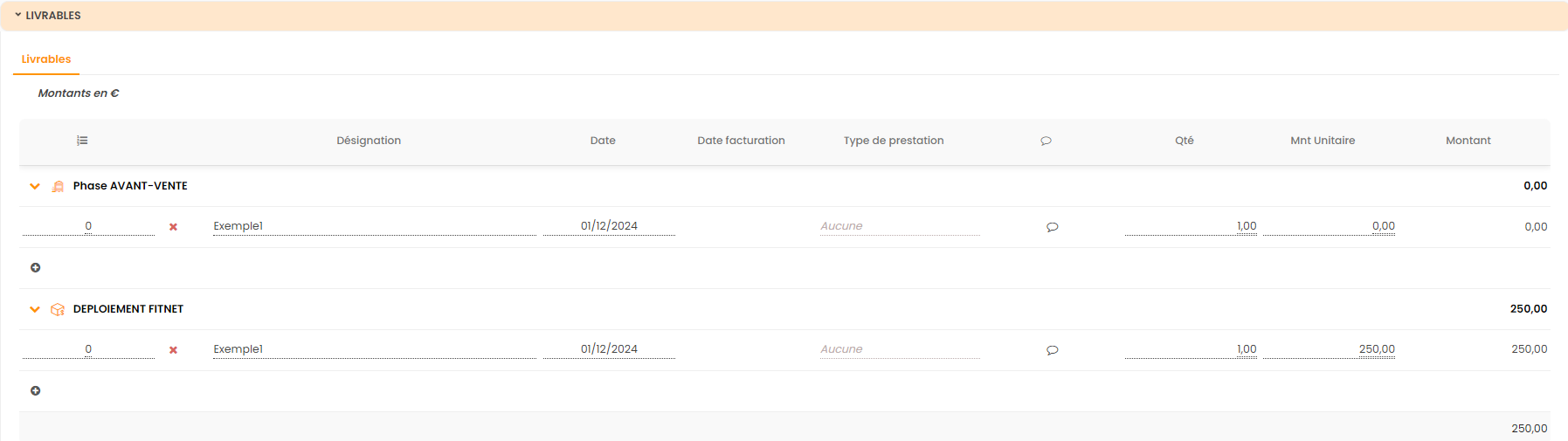 Les livrables des affaires composants le projet sont visibles et modifiables depuis la vue projet.