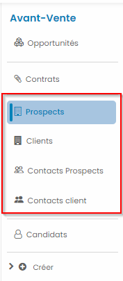 L’activation du module CRM génère la création d’un catalogue de prospects, d’un catalogue de contacts prospects et d’un catalogue d’opportunités commerciales.