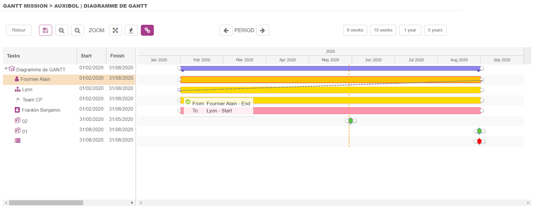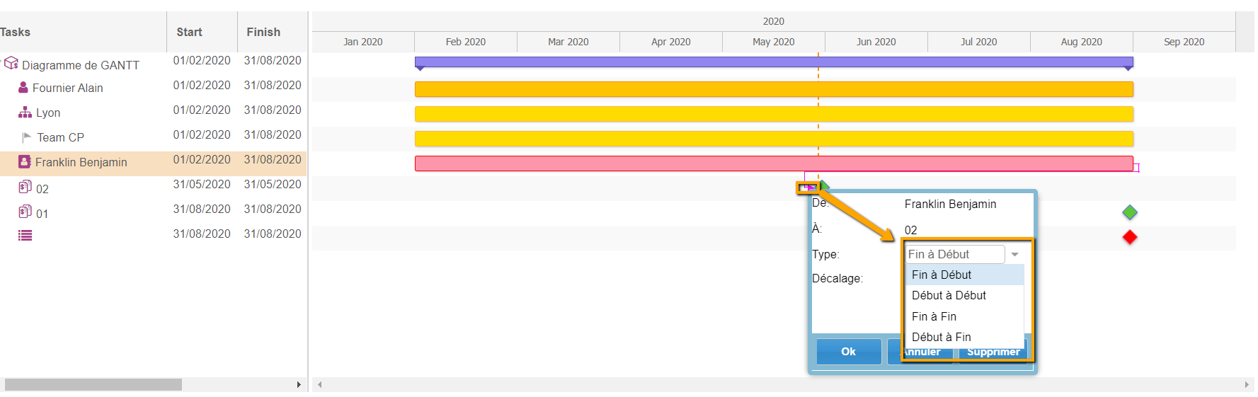 Différents types de dépendances peuvent être créés dans le Diagramme de Gantt, modifiables en double cliquant sur la dépendance.