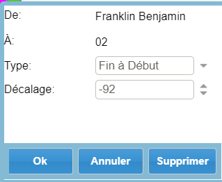 Toute dépendance est modifiable ou supprimable à souhait. Tout déplacement d'une tâche maître entraînera le déplacement de la tâche liée.