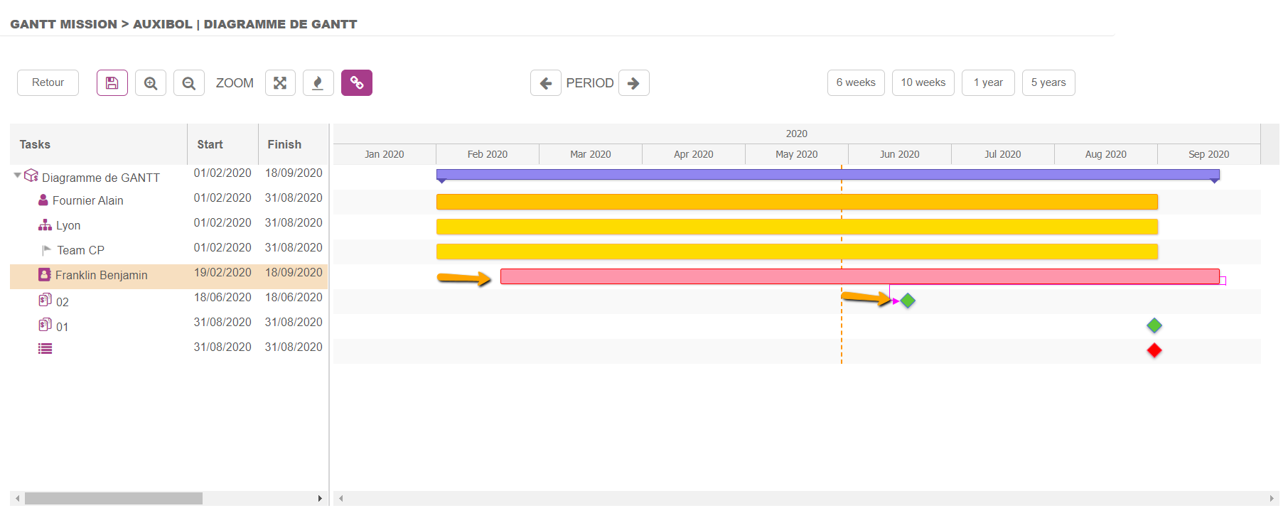 Le Diagramme de Gantt permet de créer des dépendances entre tous les objets du même niveau, c’est-à-dire :