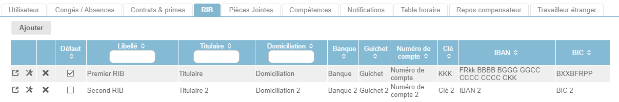 Vous avez la possibilité ainsi de saisir plusieurs RIB. En ce cas, il est nécessaire de définir quel est le RIB par défaut en cochant la case "Défaut" correspondant à un des RIB :