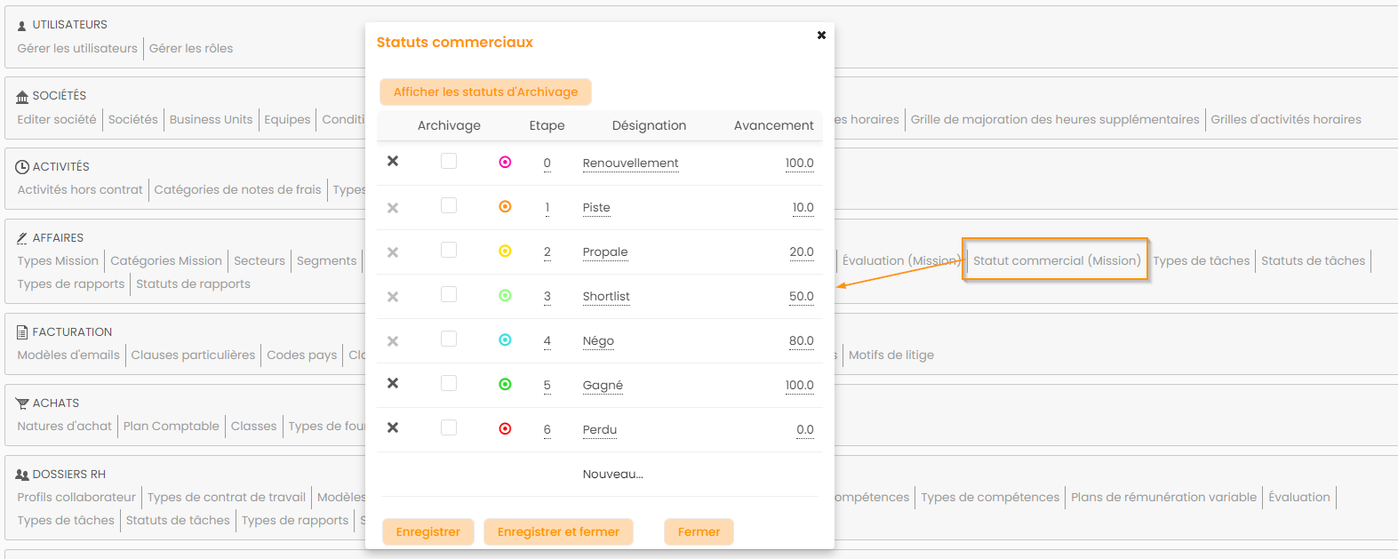 - depuis la configuration (Configuration > Affaires > Statuts commerciaux)