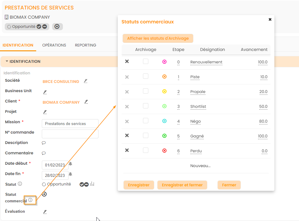 En statut opportunité d’un projet (toutes mes affaires créées sont donc également au statut opportunité), il est possible de gérer les statuts commerciaux, qui viennent qualifier l’avancement commercial du projet. Je peux le faire: