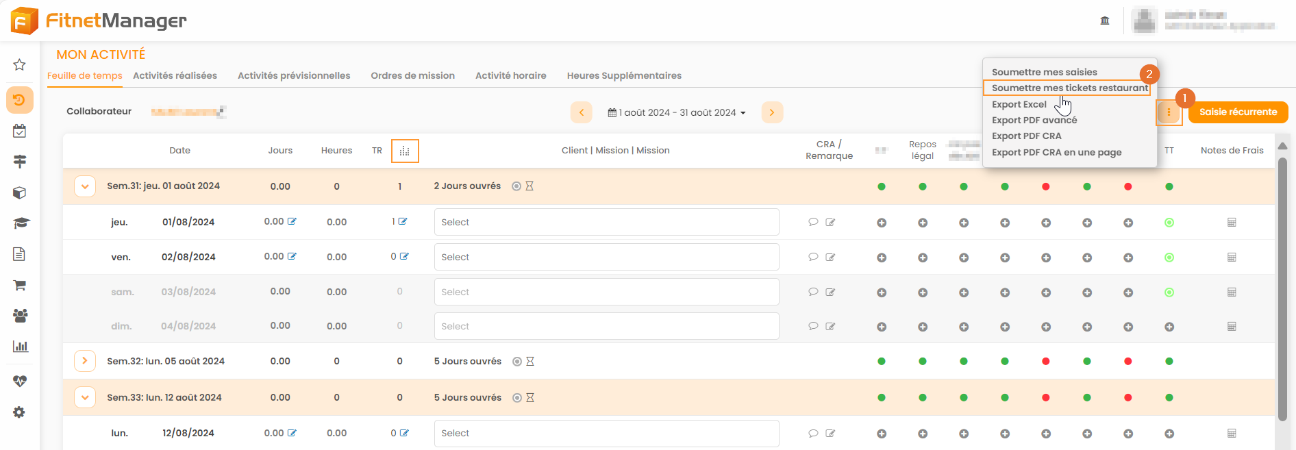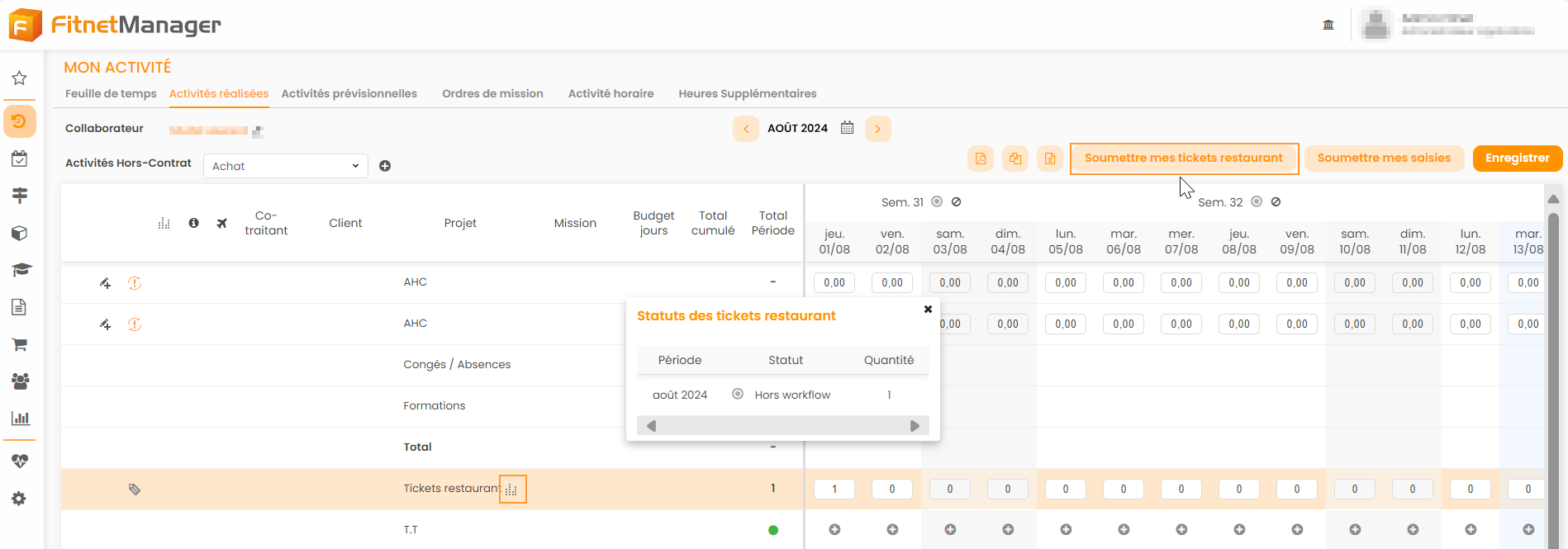 La feuille de temps permet aussi de déclarer ses droits aux tickets restaurants : en saisissant jour par jour, sur le même tableau que les activités réalisées.
