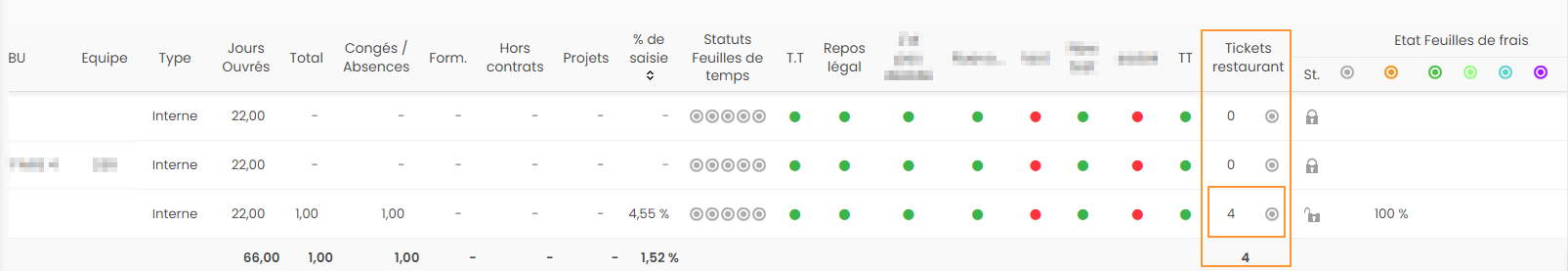 L'icône encadrée en orange sur l'impression écran ci-dessus permet d'accéder au statut et à la quantité des tickets restaurants pour la période sélectionnée.