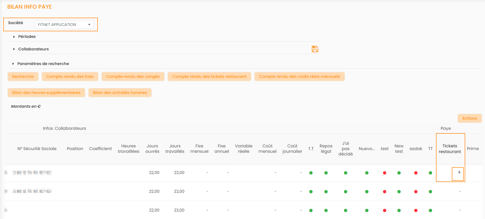 Le Reporting Activités > Bilan Info Paye, permet de consulter le nombre de tickets restaurant saisis pour le mois.