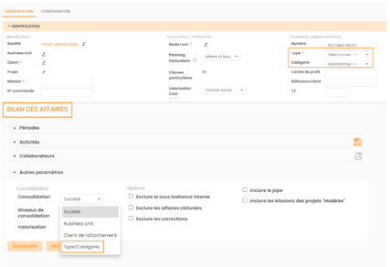 Les types d’affaire et les catégories d’affaire sont des listes que vous permettent de typer vos affaires. En plus , vous allez pouvoir faire des consolidations par type et catégorie au niveau des quelques reportings : Bilans de affaires, Suivi de production / Facturation, Indicateurs clés...
