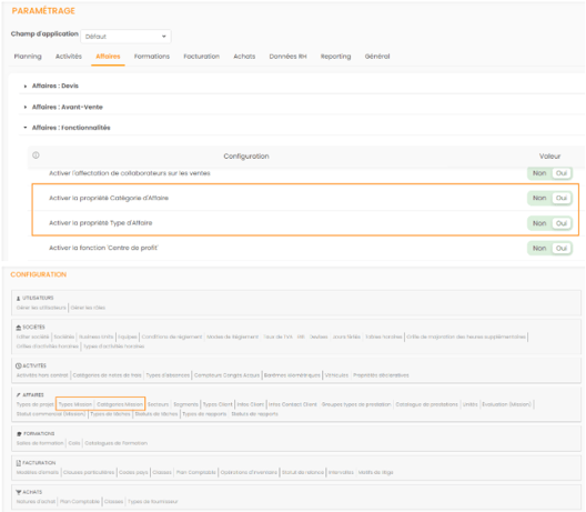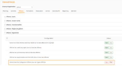 Vous pouvez aussi hiérarchiser les Catégories d'Affaire sous les Types d'Affaire, pour cela il suffit d’activer le paramètre dans Paramétrage > Onglet Affaires > Affaires : Ergonomie