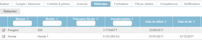 Il est possible de gérer des véhicules depuis la configuration et depuis les fiches collaborateurs du module Dossiers RH.