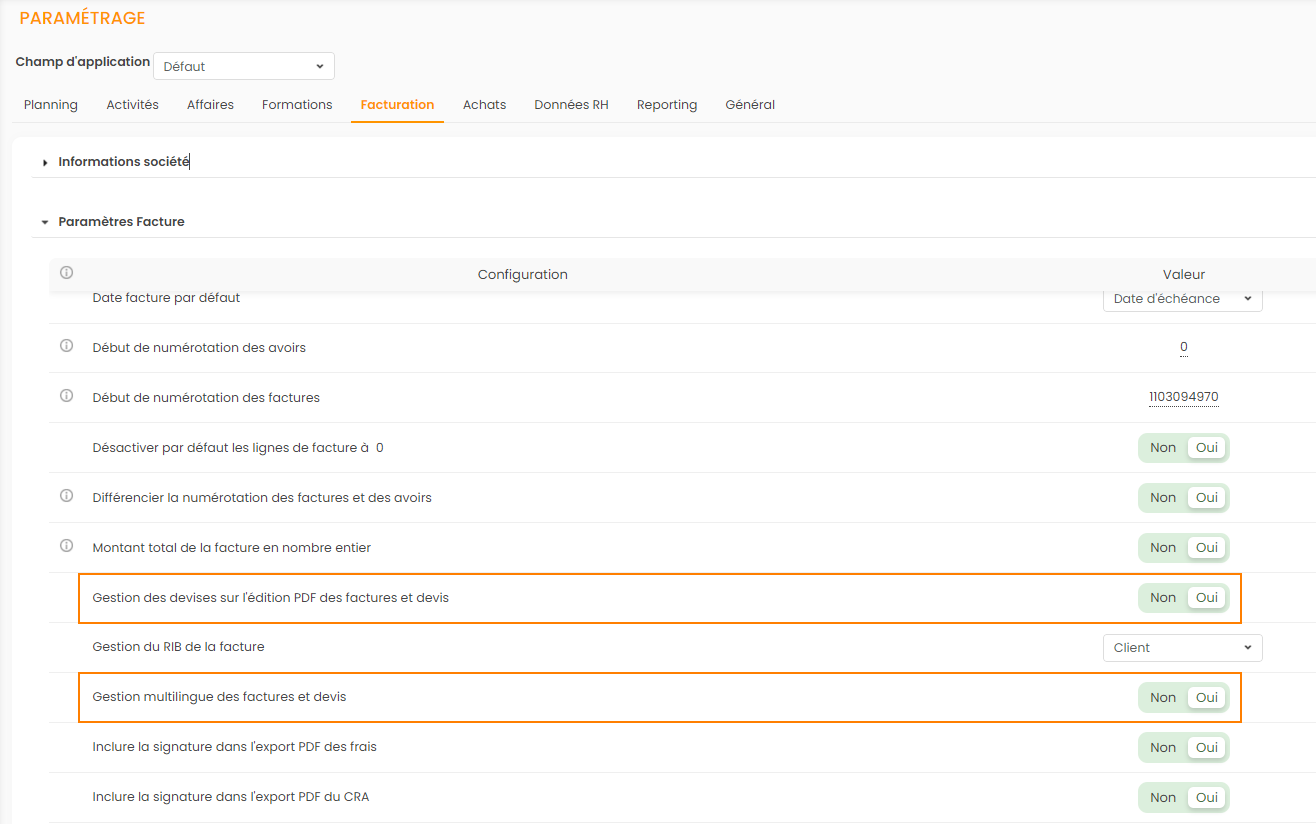 Paramétrage > Facturation > Paramètres Facture