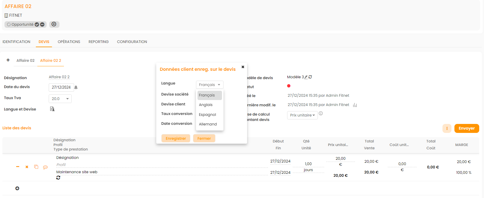 Vous pouvez ensuit modifier la langue et la devise de votre devis en cliquant sur l'onglet ci-dessous :