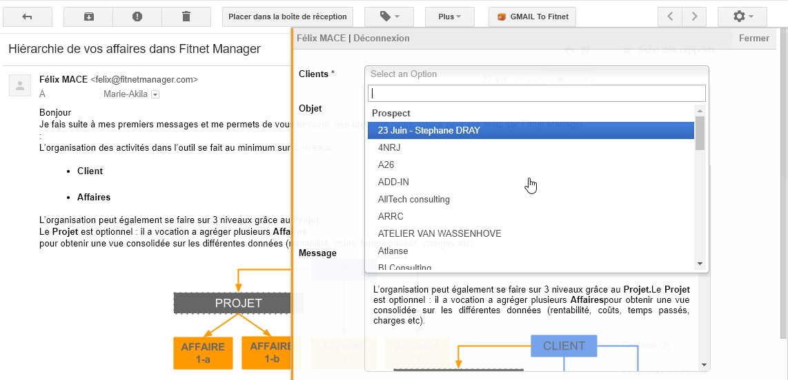 Ensuite une Pop-up s'ouvre, puis sélectionnez le client/prospect sur lequel vous voulez voir apparaître le mail :