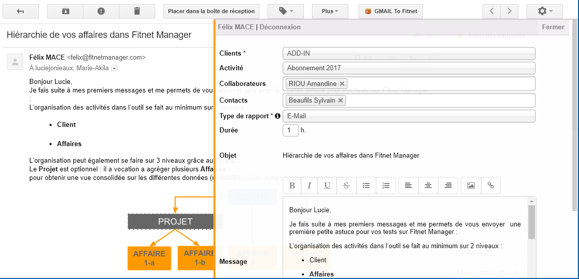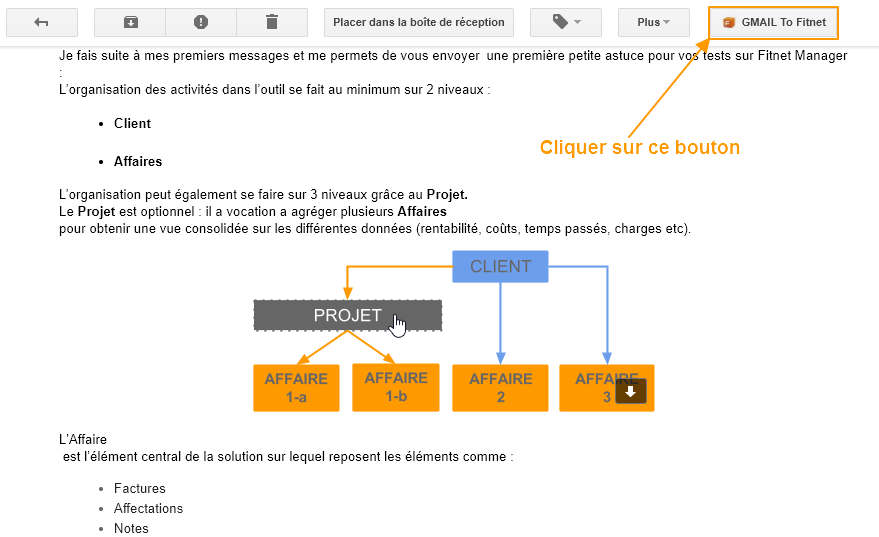 Pour transférer un mail de Gmail à Fitnet, il suffit d'aller sur le mail que vous voulez afficher dans Fitnet et cliquer sur le bouton GMAIL To Fitnet :